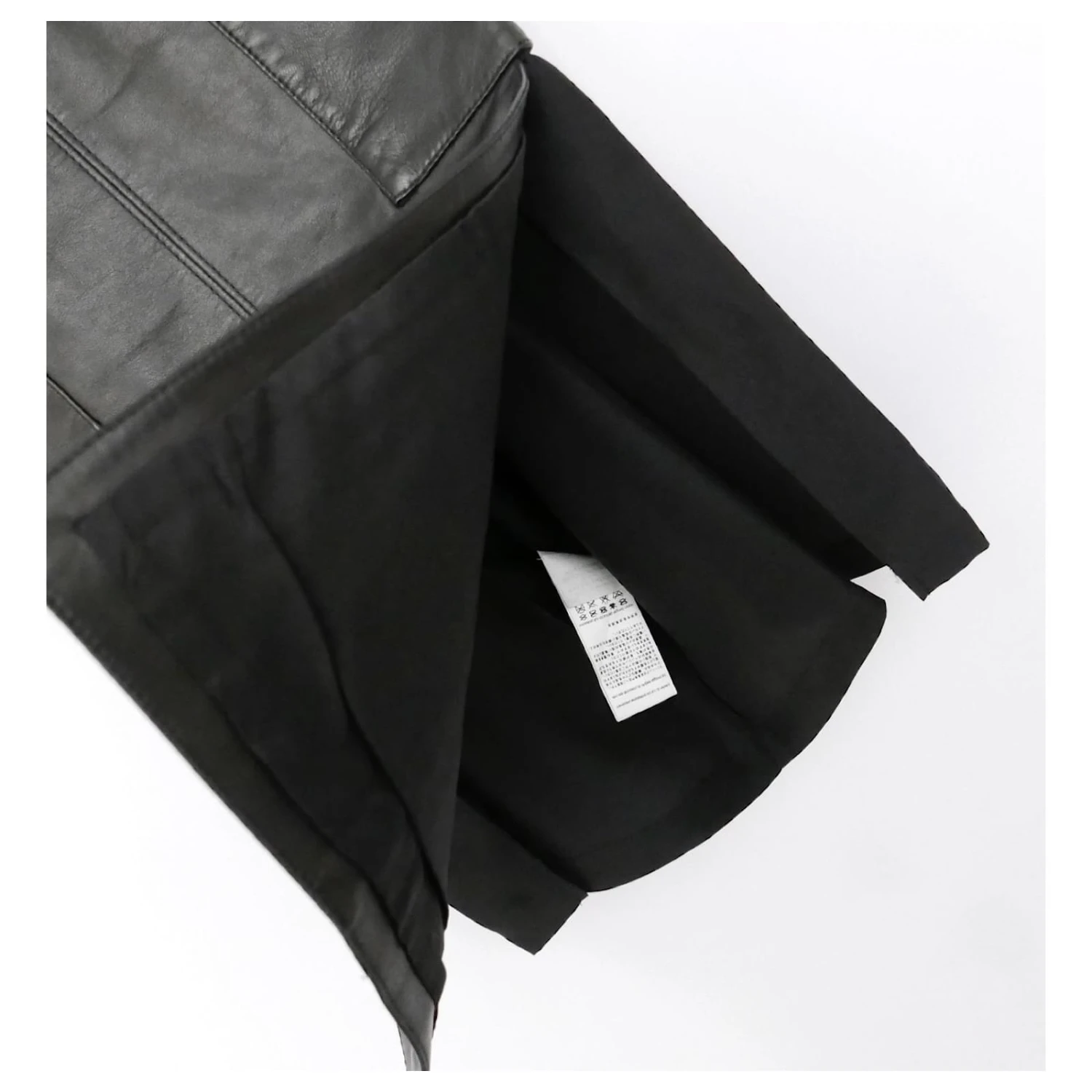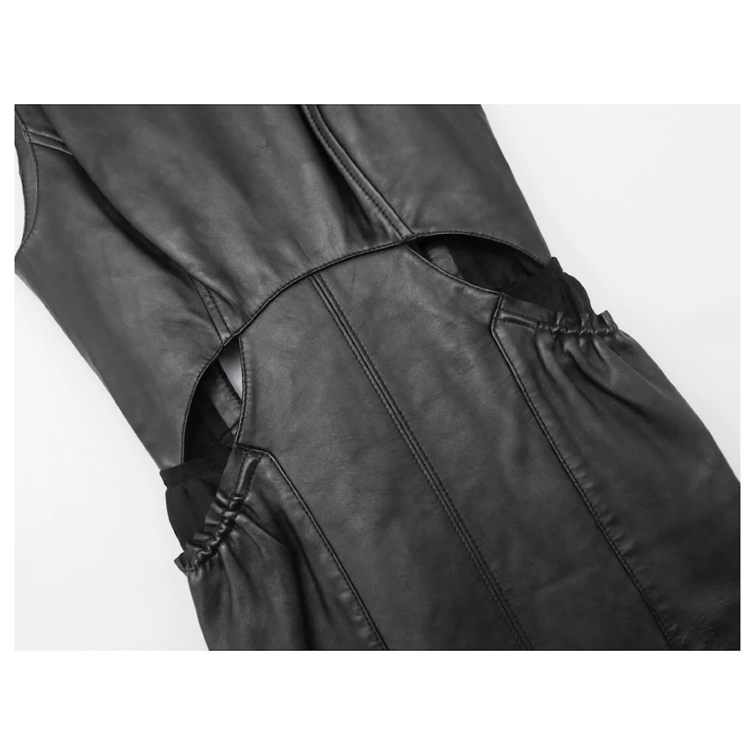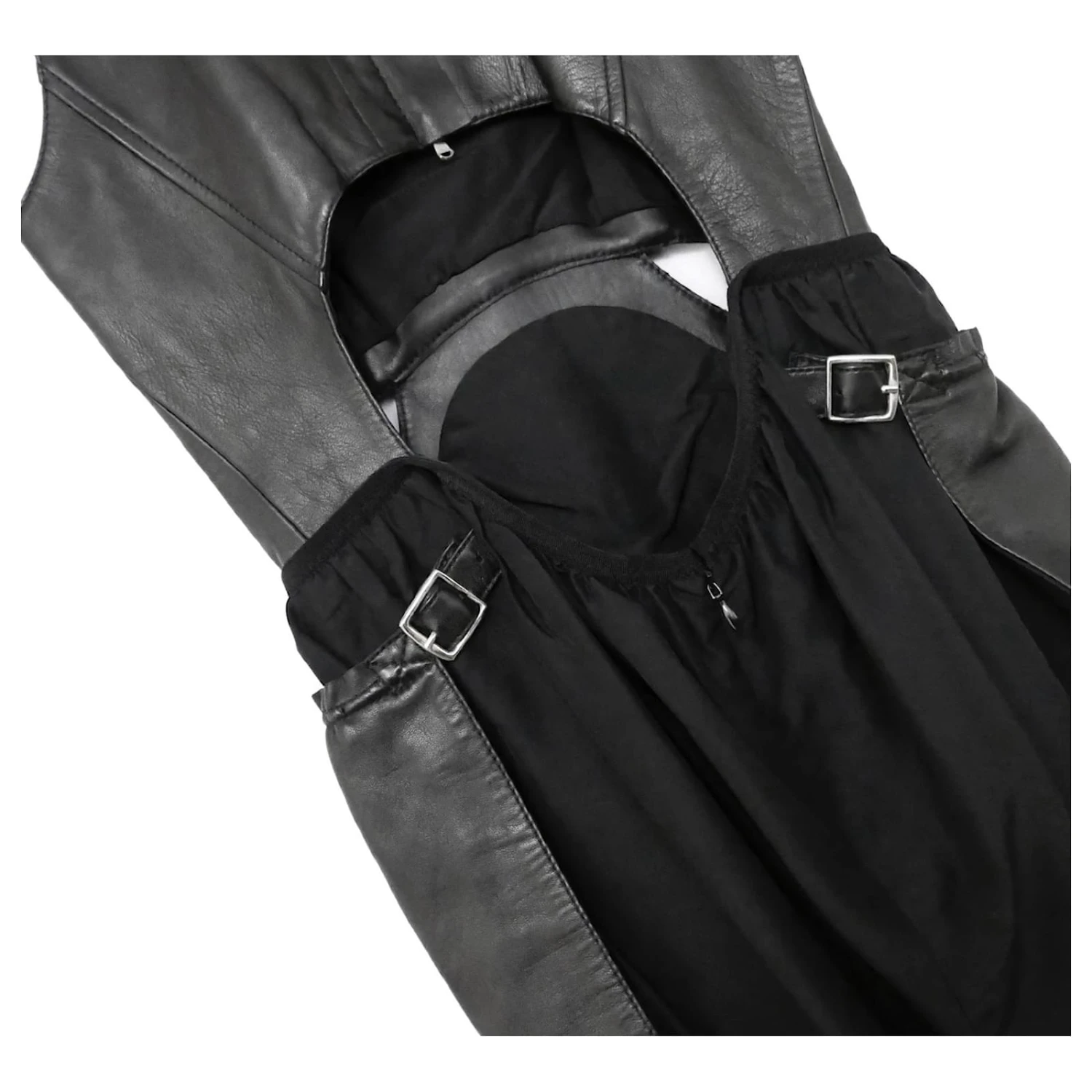 Hergestellt aus superweichem schwarzem Lammleder mit weichem Seidenrock. Es hat Ausschnittdetails, Schlüsselloch-Rücken und Schürzen-Frontrock. Reißverschluss nach hinten.
