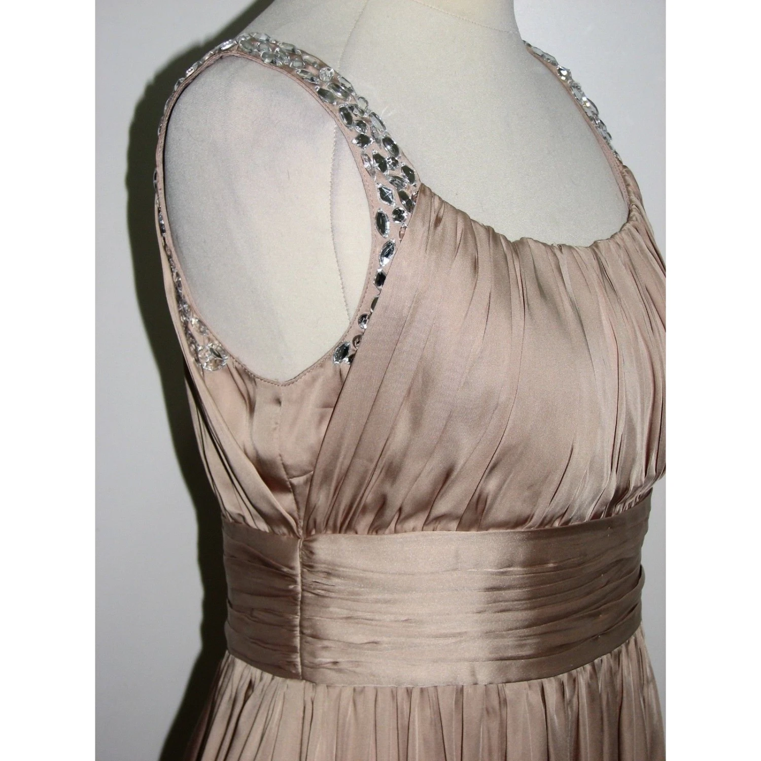 Die Farbe ist nackt mit einem Hauch Gold, Das Kleid ist komplett gefüttert und die Träger sind mit großen Strasssteinen bestickt, der Rock flattert aus und schwingt bei jeder Bewegung.