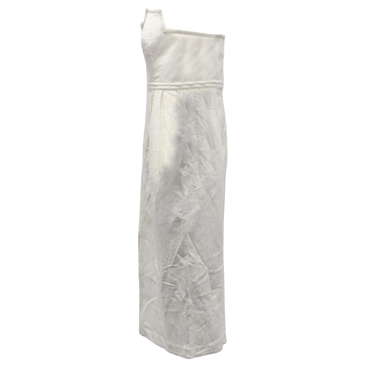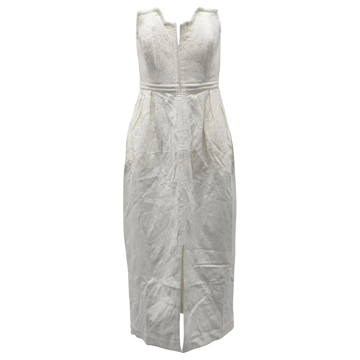 Dieses moderne trägerlose Säulenkleid Aurelia von Mara Hoffman wird Ihr nächstes Lieblingskleid! Es verfügt über ein skulpturales und eng anliegendes Art-Deco-Mieder zur Unterstützung, festgesteckte Taille und schmaler Rock mit Schlitz in der Mitte vorne, Unsichtbarer Reißverschluss hinten, und es besteht aus einer atmungsaktiven Mischung aus Bio-Baumwolle und Leinen mit einem tonalen Ton, strukturierter floraler Jacquard. Tragen Sie das Kleid mit Wedges und goldfarbenen Accessoires für einen gehobenen Stil.