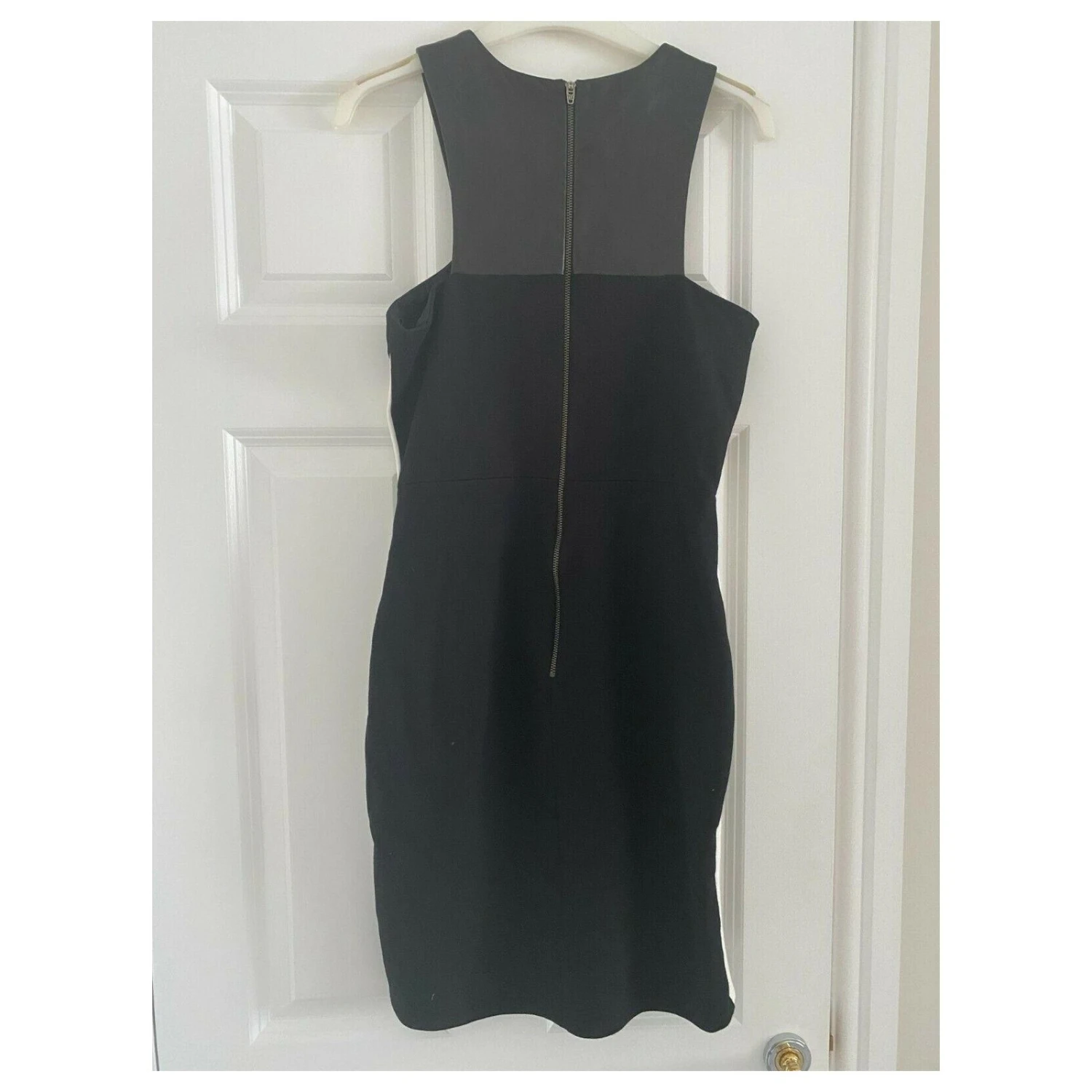 Schwarz-weißes Mason-Kleid mit einer großen Lederpasse hinten und vorne, Vollständig gefüttert mit einem freiliegenden Reißverschluss hinten, Das Kleid selbst ist aus Rayon (Viskosemischung mit Elasthan so super dehnbar) perfekte Passform für ein Großbritannien 10 zu vielleicht a 12, sehr kleine Gebrauchsspuren, die beim Tragen nicht sichtbar sind.