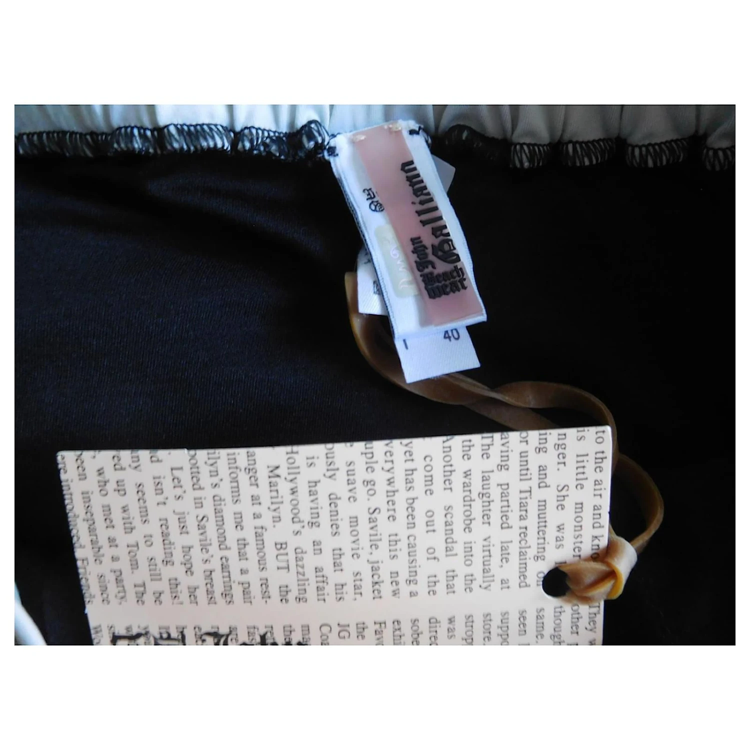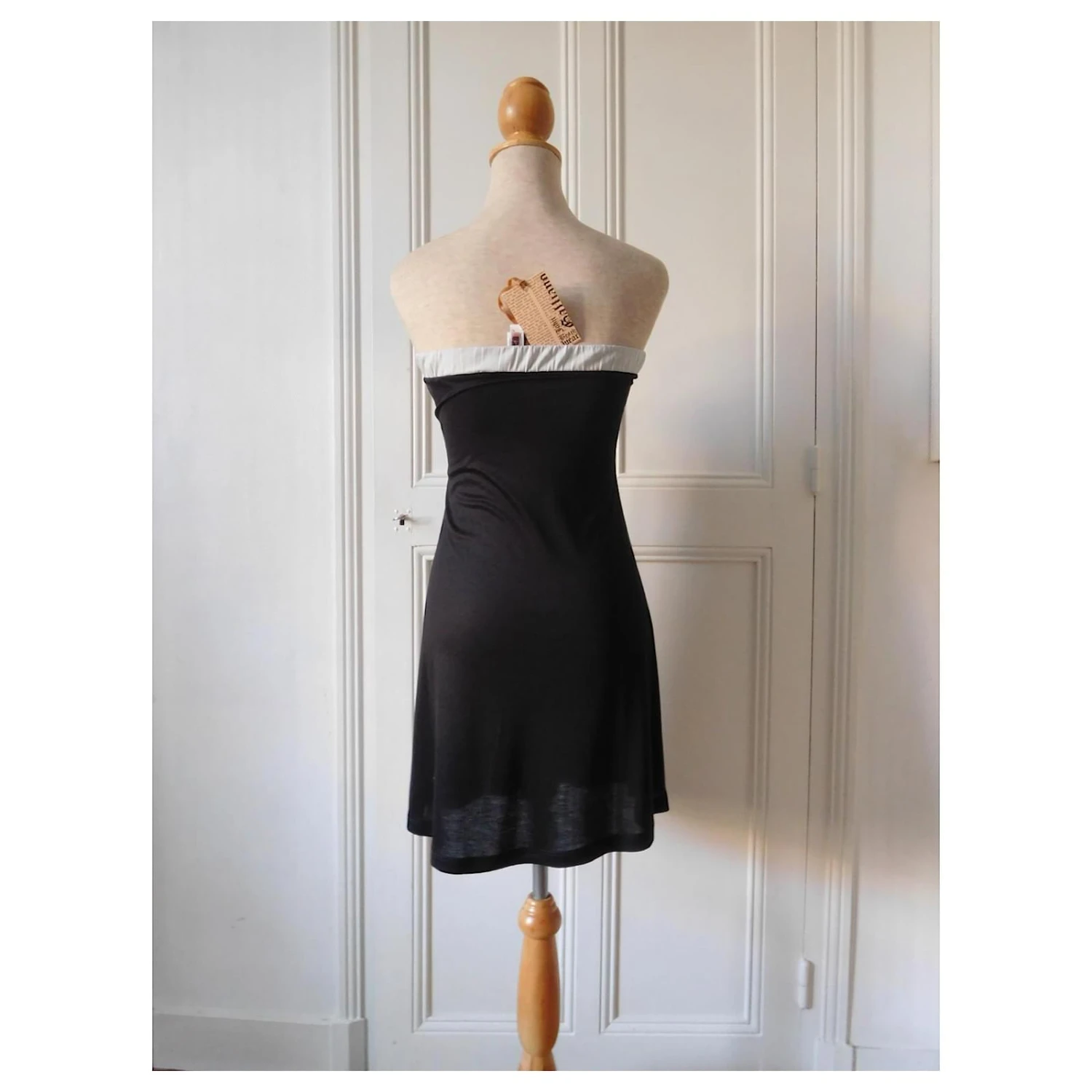 John GALLIANO – 38 . Kurzes schwarzes trägerloses Kleid, Neu mit Tag. Es besteht aus einem leichten und fließenden Stoff (80% Viskose und 20 % Poliester). Es gibt zwei Gummibänder, in Grautönen, eine über der Brust und eine direkt darunter. Kleine flache Falten auf der Vorderseite des Kleides.