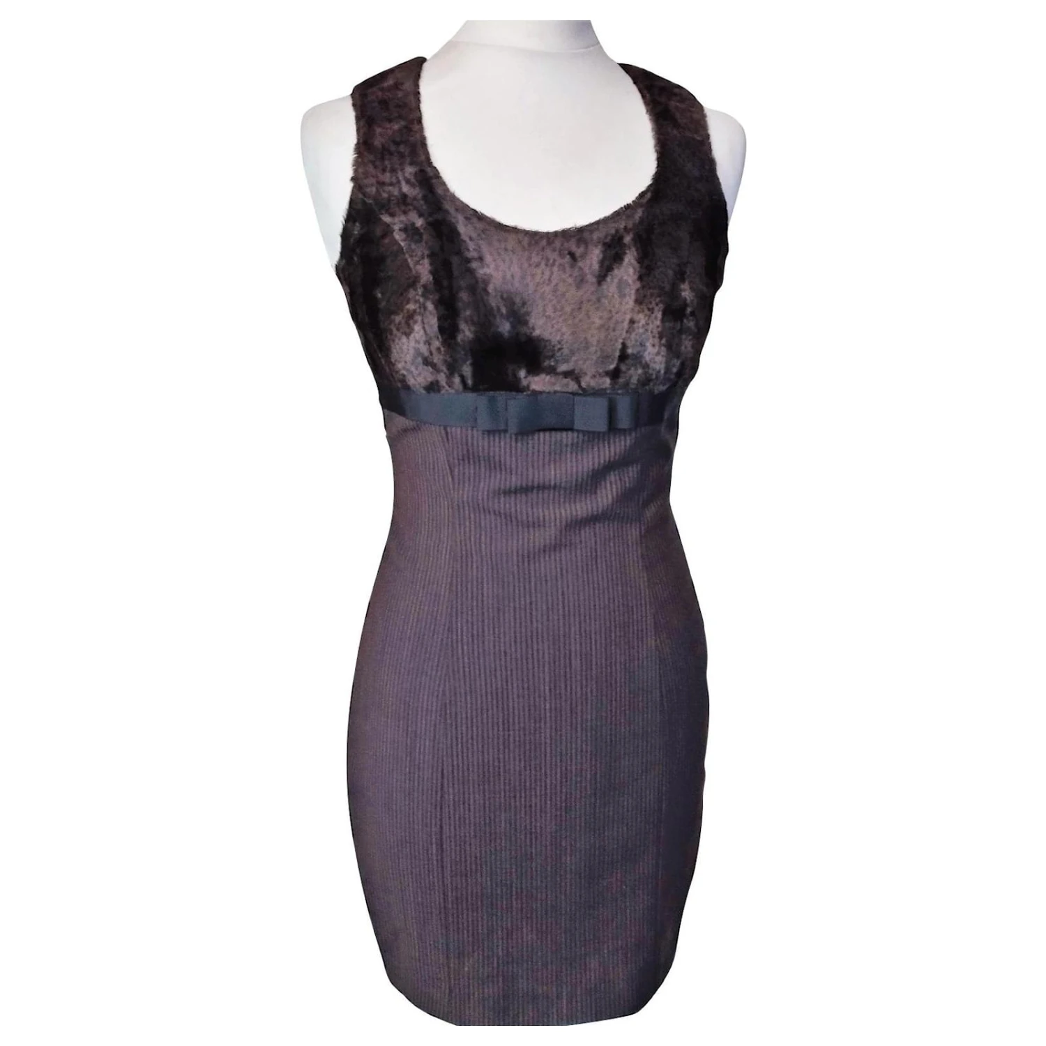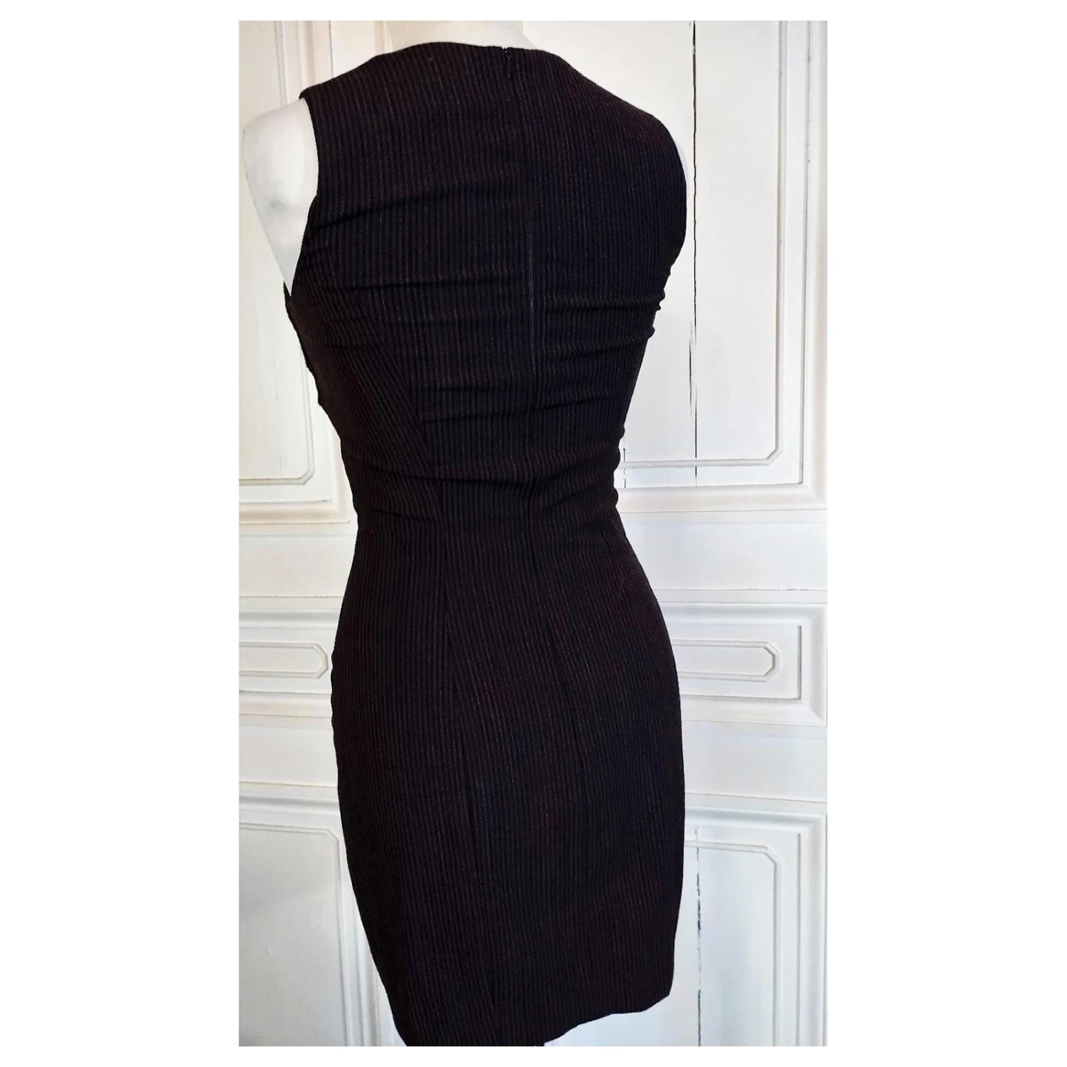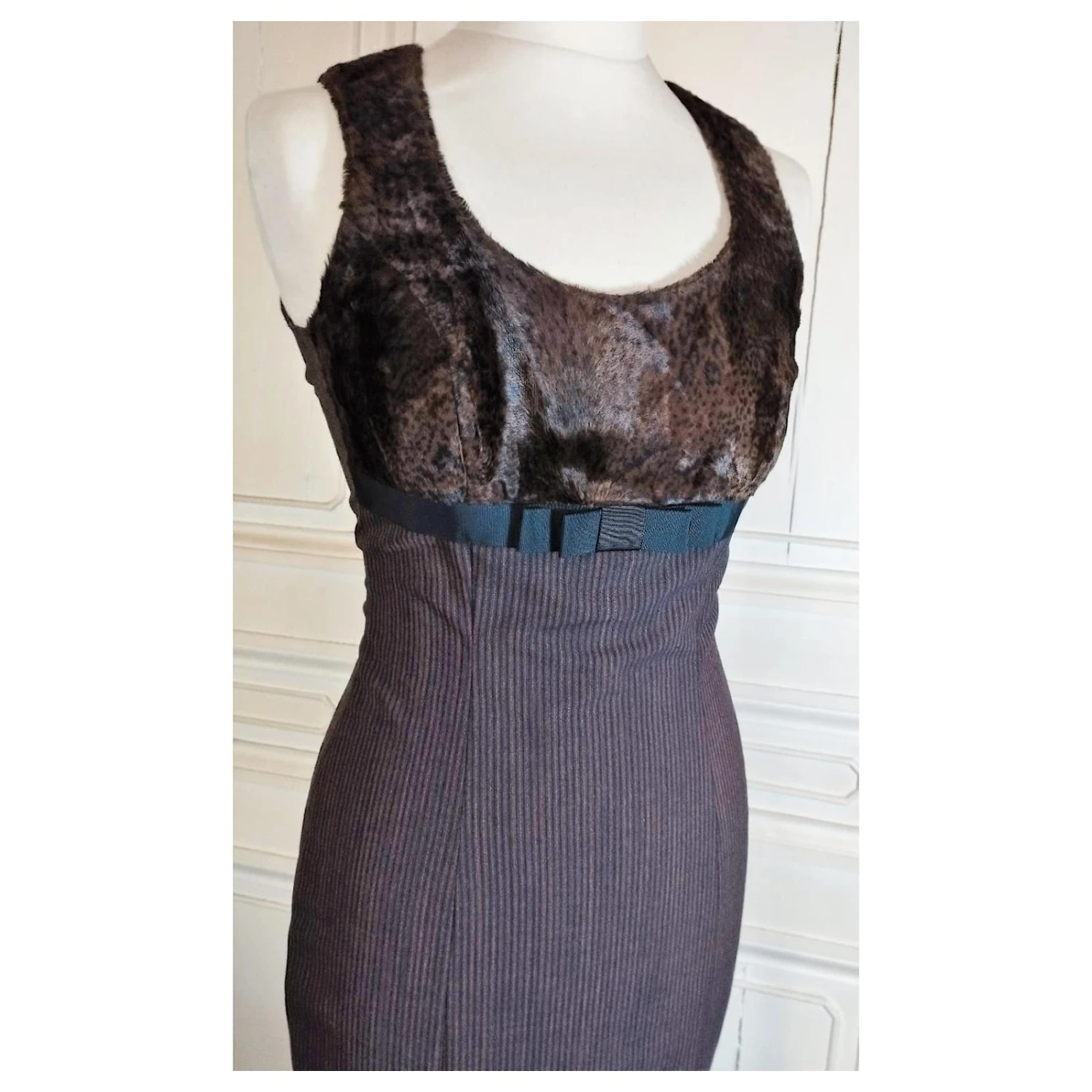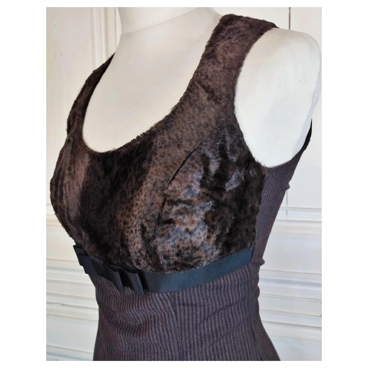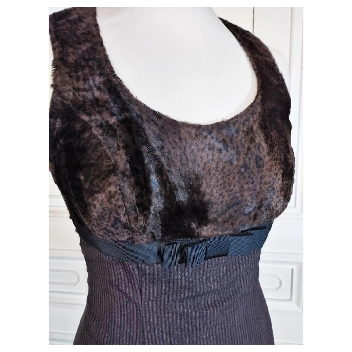 KLEIDKÖRPER FEINER BAYADERE-STOFF AUS LEICHTER WOLLE SCHWARZE SCHOKOLADE UND MIKROPUNKTETE STROH