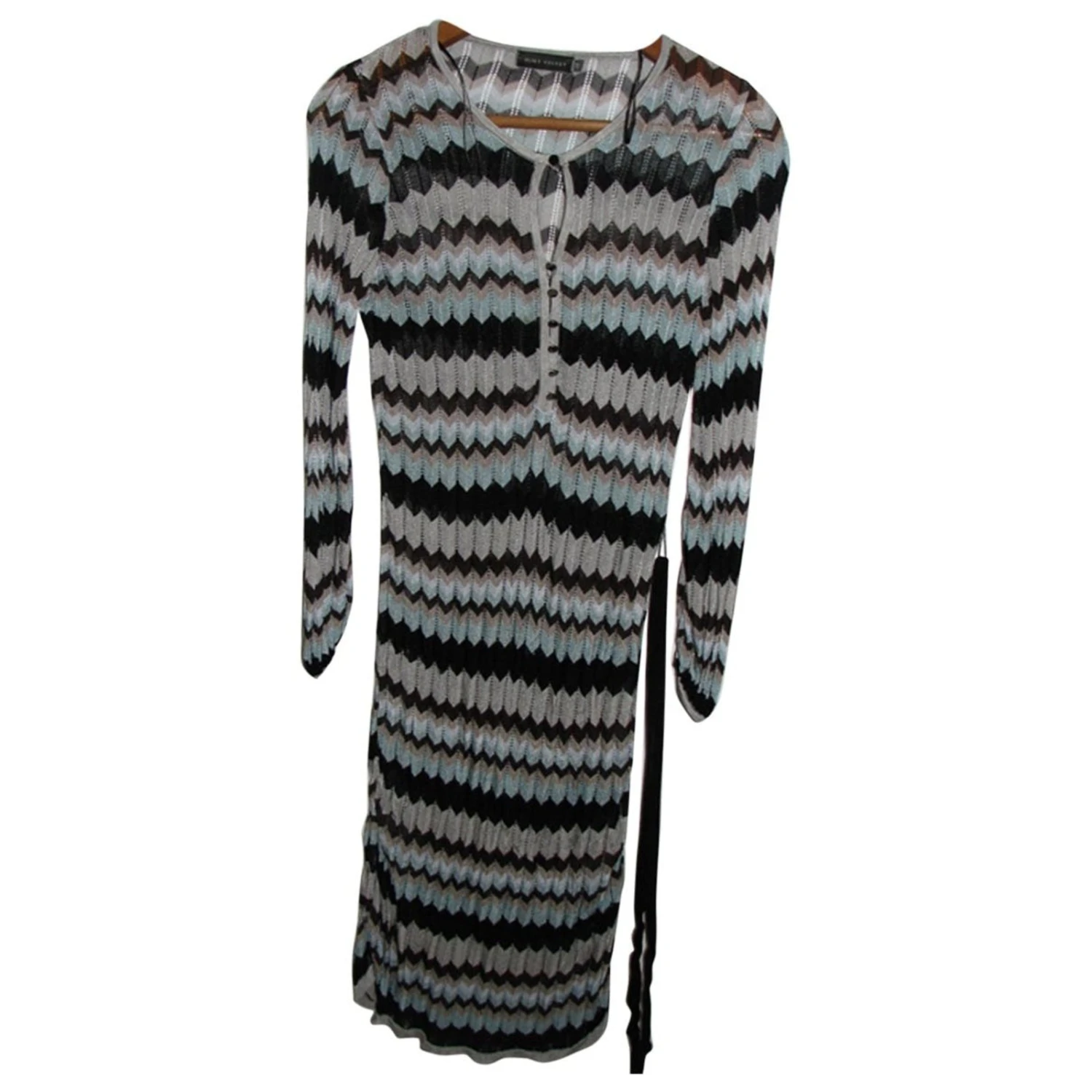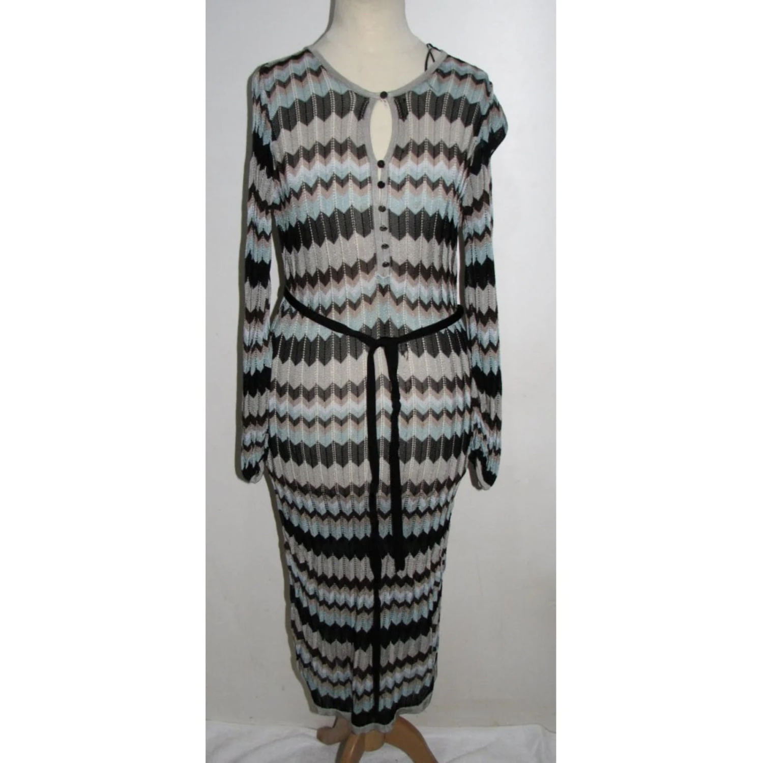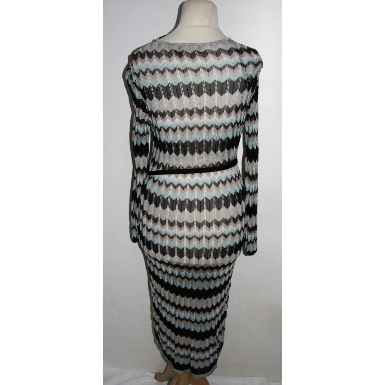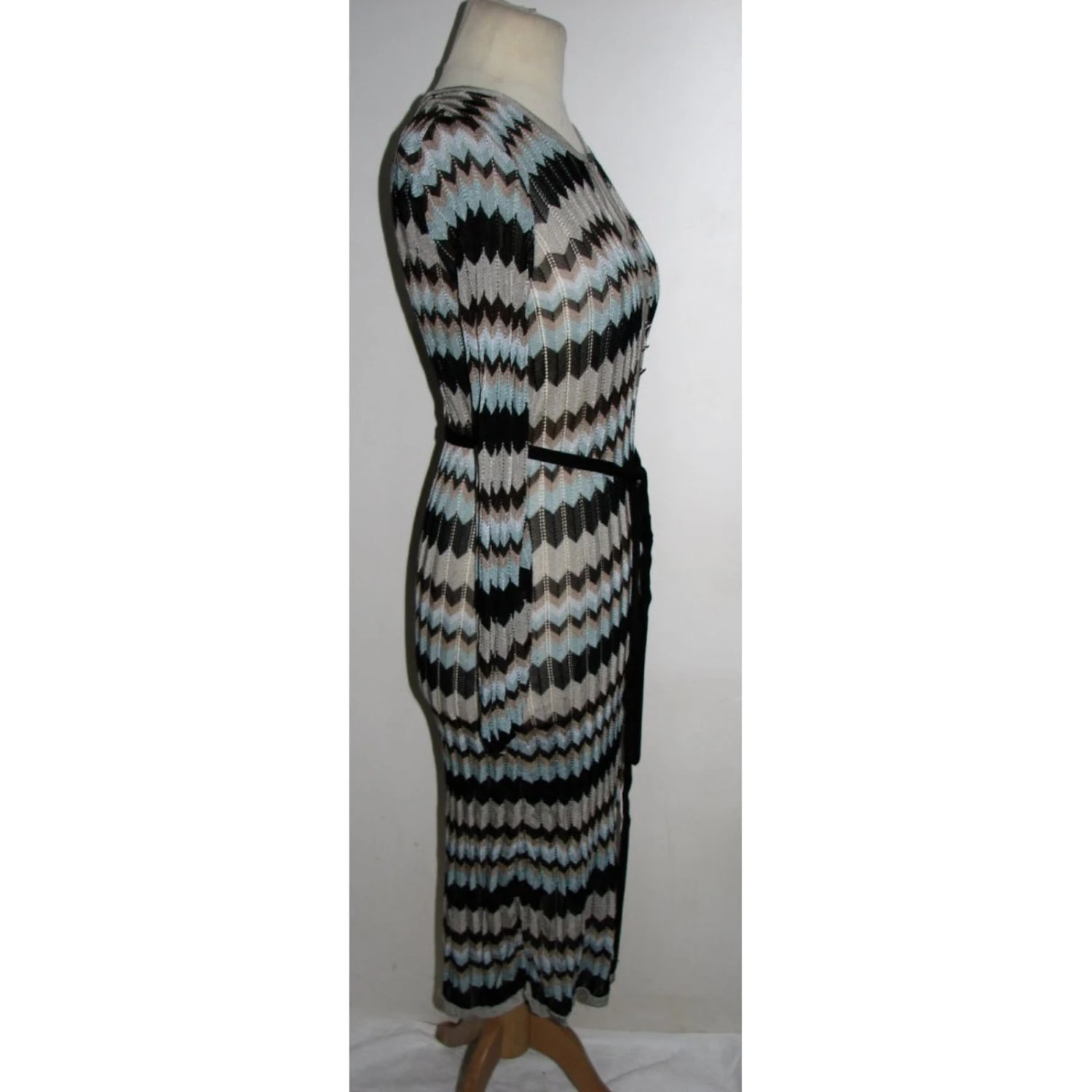 Mint-Samtkleid aus Viskose mit Missioni-Muster und Gürtel, schließt vorne mit kleinen silbernen Knöpfen und ist sehr dehnbar.