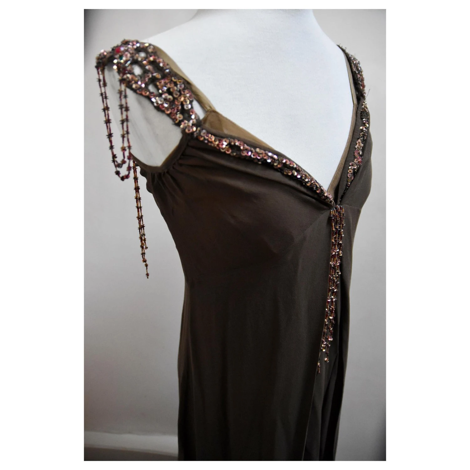 New Antik Batik Braune Seide 2-schichtiges Langes Kleid. S