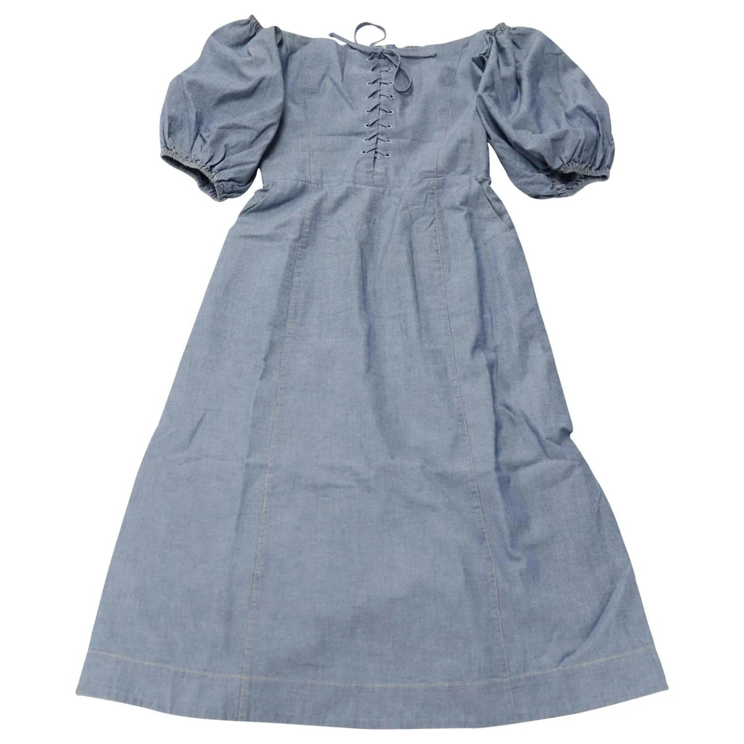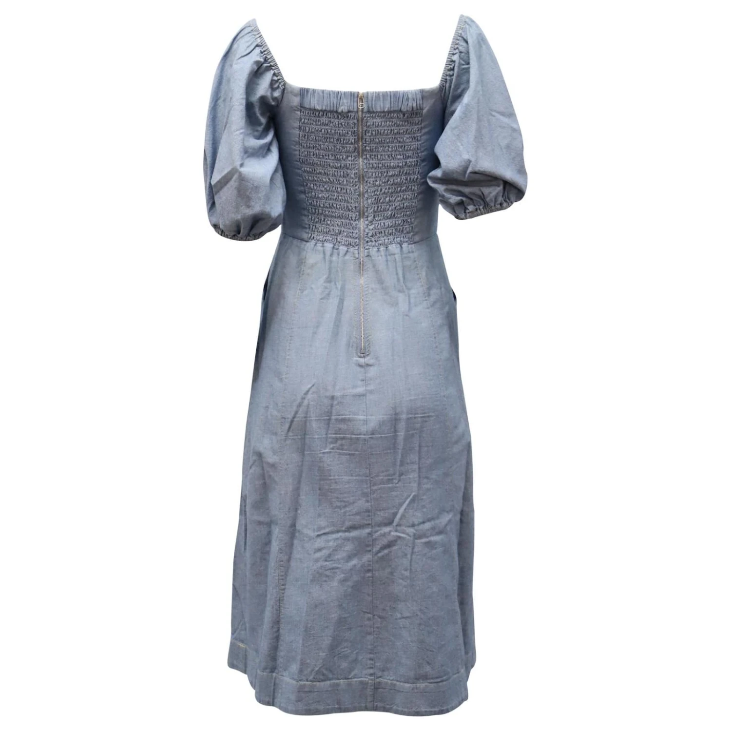 Seas Kleid hat ein figurbetontes, gerafftes Rückenmieder, das die voluminösen Puffärmel so schön kontrastiert. Es besteht aus Baumwolle und hat einen fließenden Midirock. Es wird mit einem Spitzenausschnitt für zusätzliche Eleganz vervollständigt. Tragen Sie Ihres mit schlichten Pantoletten und Goldschmuck.