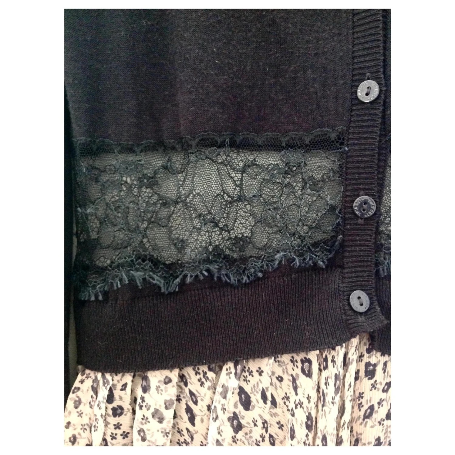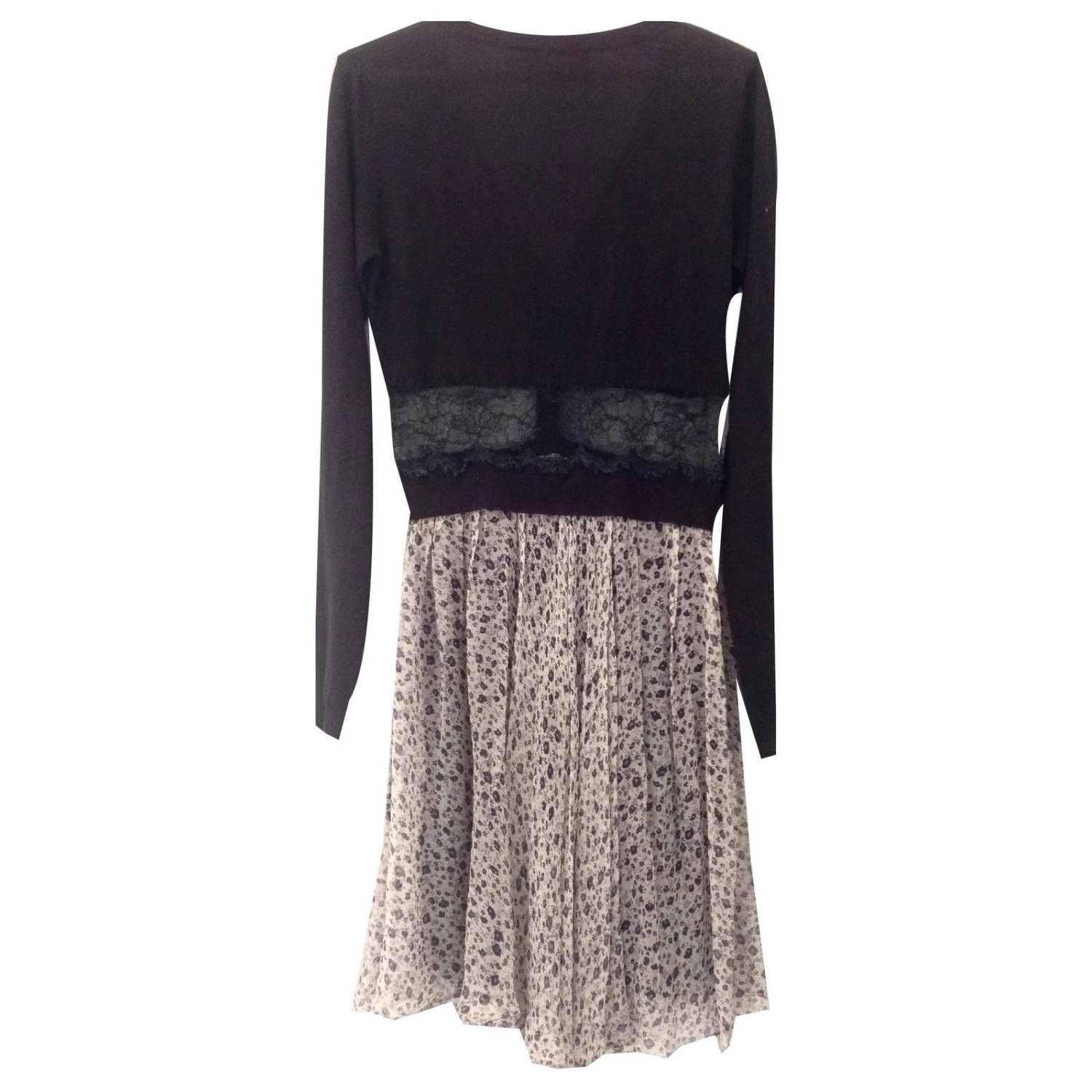 Dunkelblaues Westenkleid mit Spitzenteil und weichem, geblümten Crêpe-Rock aus Seide, der mit einem Petticoat gefüttert ist.