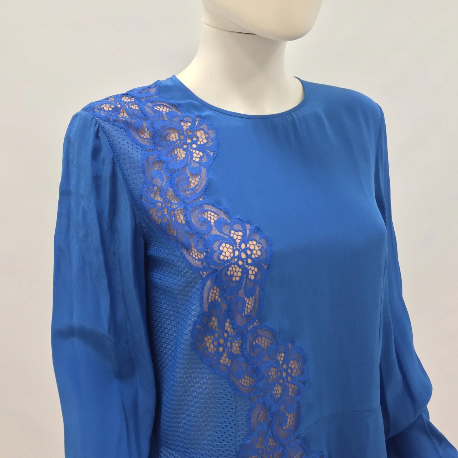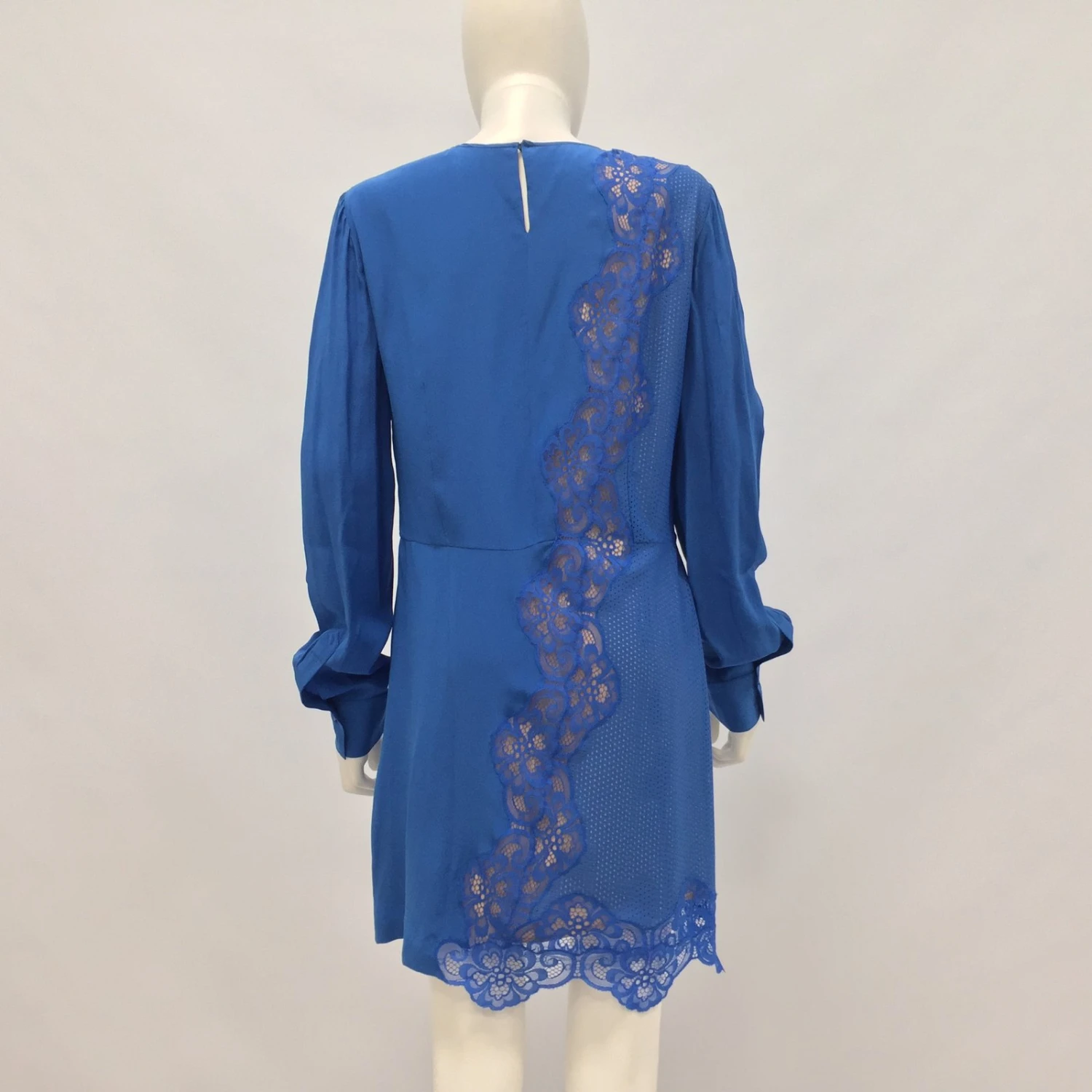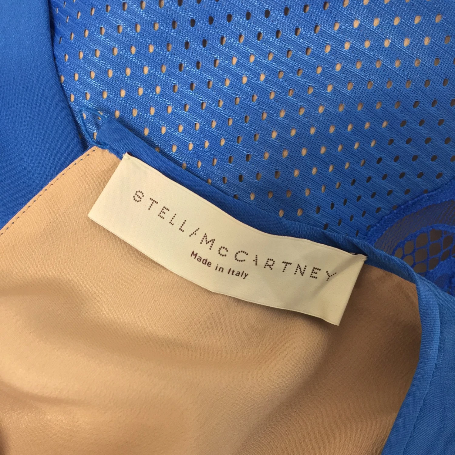 Super modisches und feminines Cocktailkleid von Stella McCartney. In elektrischer Farbe blau, Seidenstoff mit einseitiger Einlage aus perforiertem Polyester und diagonalem Spitzeneinsatz. Knopfverschluss hinten und verdeckter seitlicher Reißverschluss. Gefüttert mit Acetat / Viskose-Gewebe, beige Farbe. Knöpfe Manschetten. Größe IT44, bequeme Passform. Länge 87cm, Schultern 39cm, Ärmel 68cm, Brust 46cm. Hergestellt in Italien. Völlig neu, intakte und perfekte Bedingungen, nie benutzt oder getragen. Keine Tags