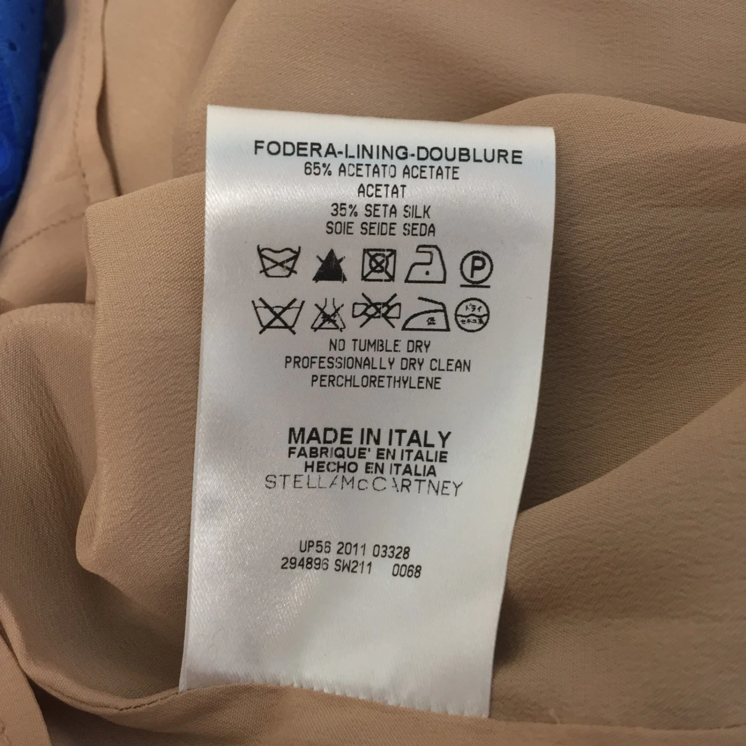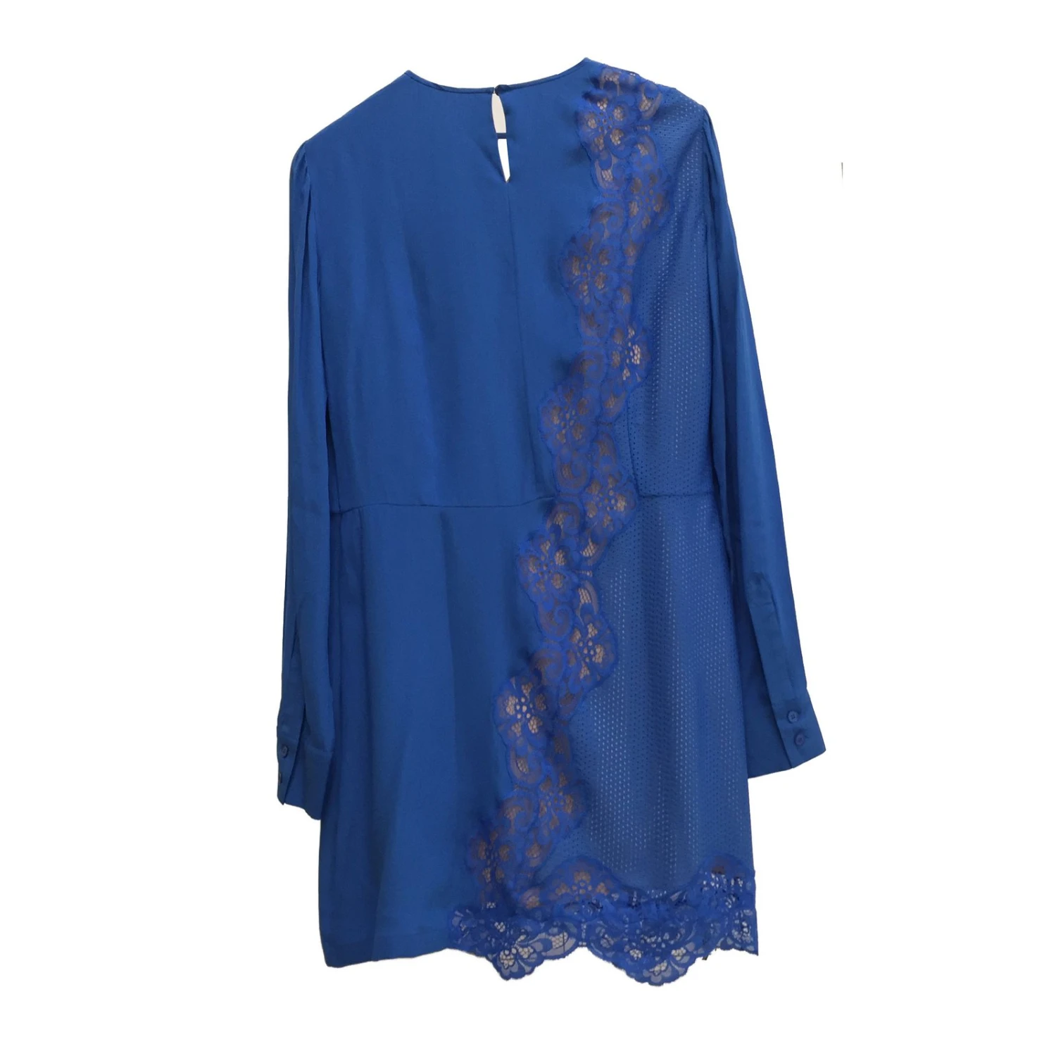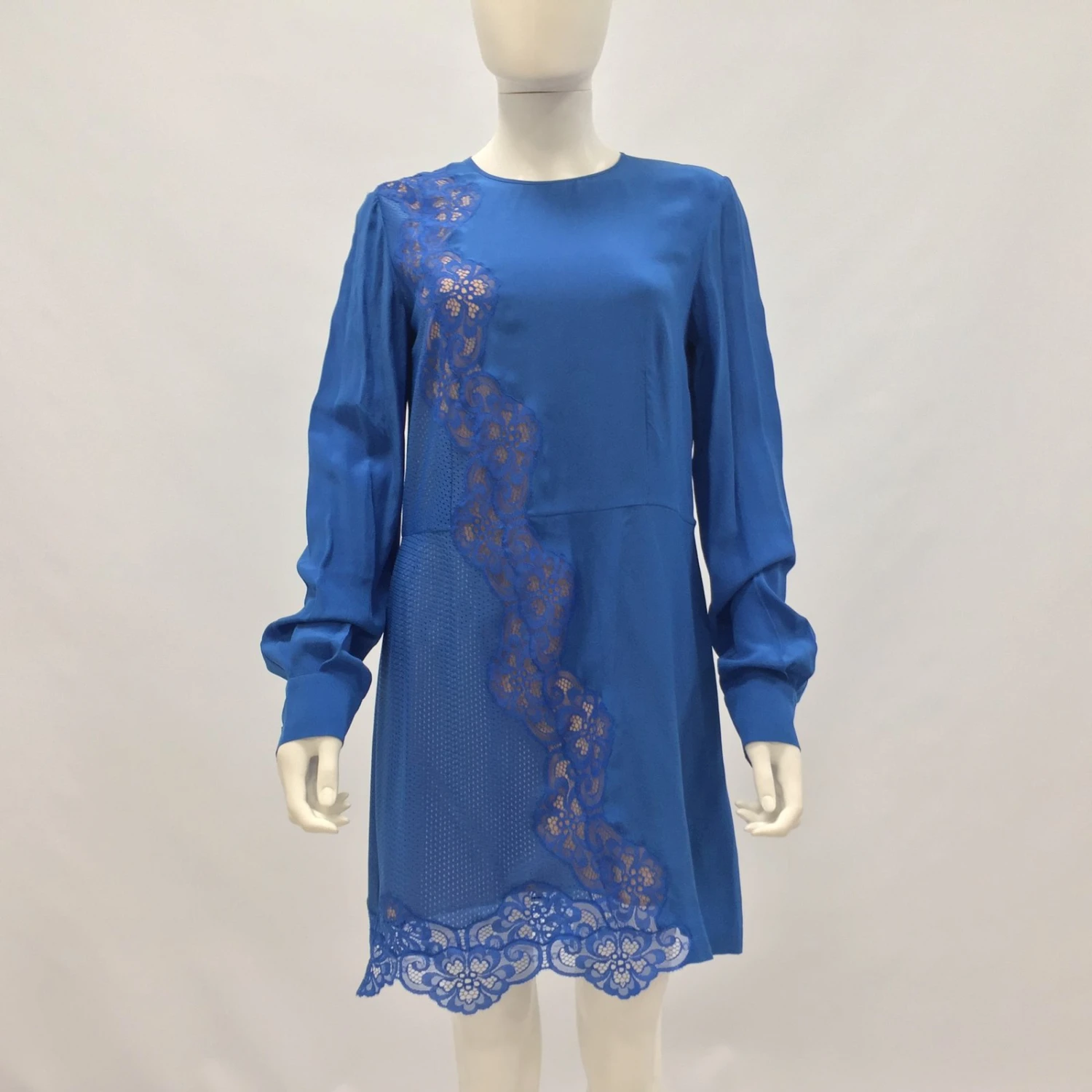 Super modisches und feminines Cocktailkleid von Stella McCartney. In elektrischer Farbe blau, Seidenstoff mit einseitiger Einlage aus perforiertem Polyester und diagonalem Spitzeneinsatz. Knopfverschluss hinten und verdeckter seitlicher Reißverschluss. Gefüttert mit Acetat / Viskose-Gewebe, beige Farbe. Knöpfe Manschetten. Größe IT44, bequeme Passform. Länge 87cm, Schultern 39cm, Ärmel 68cm, Brust 46cm. Hergestellt in Italien. Völlig neu, intakte und perfekte Bedingungen, nie benutzt oder getragen. Keine Tags